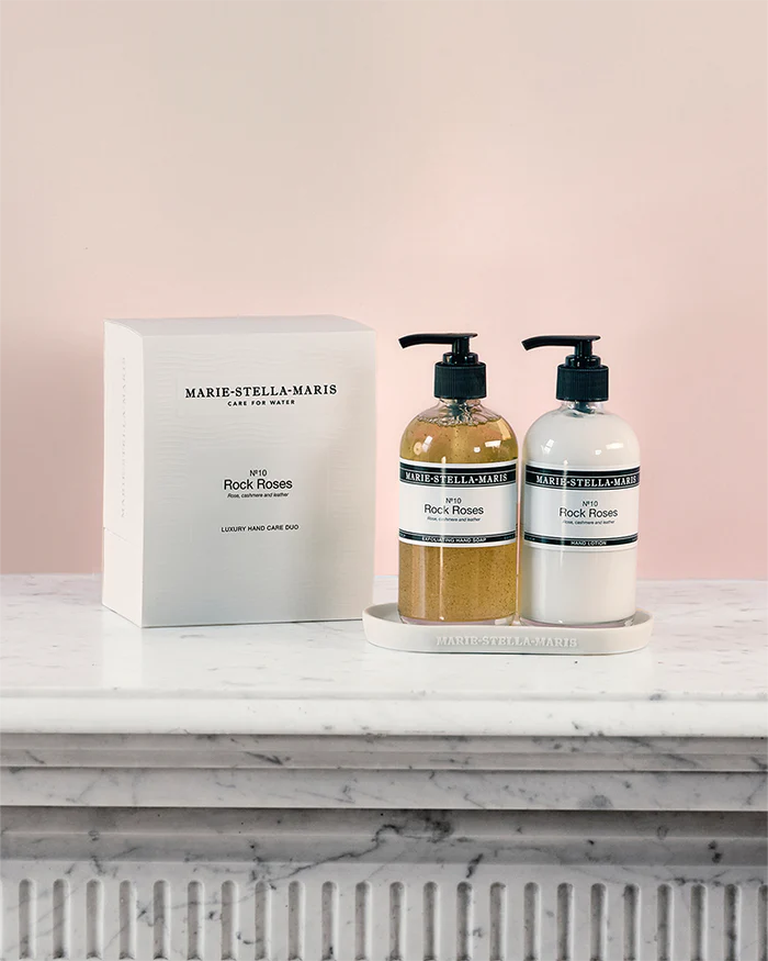 Ervaar luxe handverzorging met onze de Luxury Hand Care Essentials. Deze set bestaat uit een verzorgende exfoliërende handzeep, een voedende handlotion en een elegante tray. De formule van de handlotion trekt snel in en is verrijkt met shea butter en zonnebloemolie voor intense hydratatie. Geniet van zachte, verzorgde handen in de verleidelijke geur No.10 Rock Roses met tonen van roos, kasjmier en leder. Ideaal voor een dagelijks verwenmoment voor jezelf of een ander! Deze gift set bestaat uit: